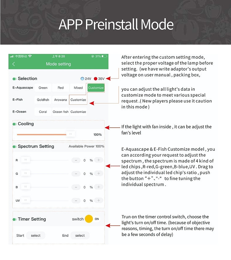 | Model | Power | Spectrum | Voltage | Iumens | LED Qty RGB+UV | Tank Size |