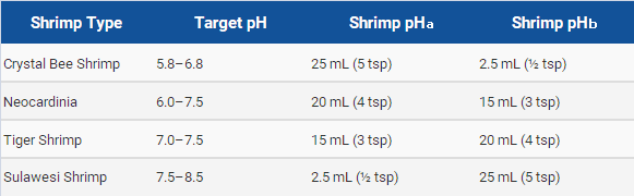 Use when setting up an aquarium and when making water changes. Use with shrimp pHa to target a pH (see chart). All doses given are for 20 L (5 US gallons). Doses can be safely doubled if needed. In cases of sensitive shrimp or to avoid the risk of any pH shock, consider breaking dosing up over a 12 –24 hour period.