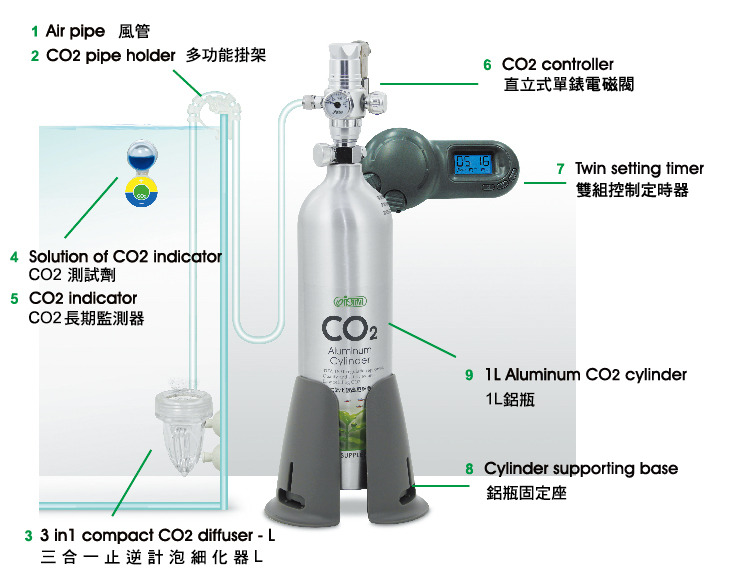 Functions of CO2 bubble counter, check valve and diffuser in one unit.