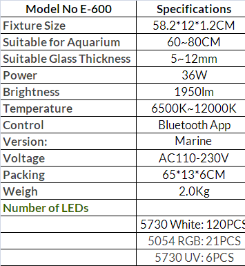 Number of Marine LEDs: 5730 Blue: 80PCS, 5054 RGB: 14PCS, 5730 UV: 4PCS