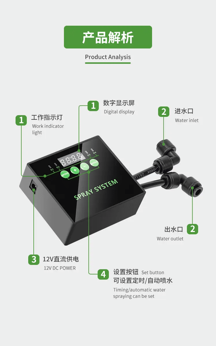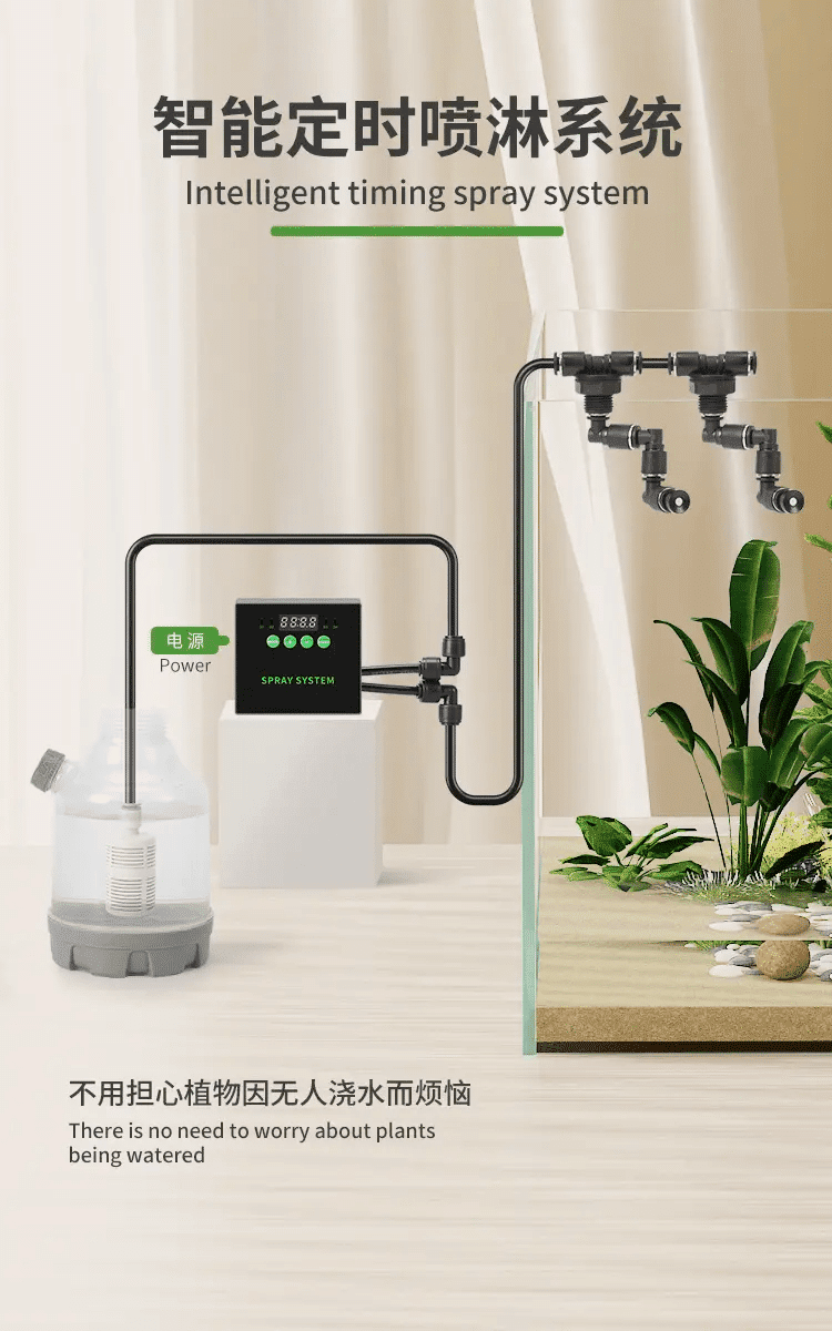 • Set spray intervals, duration, and timing with the built-in digital display. Your enclosure stays perfectly hydrated around the clock.